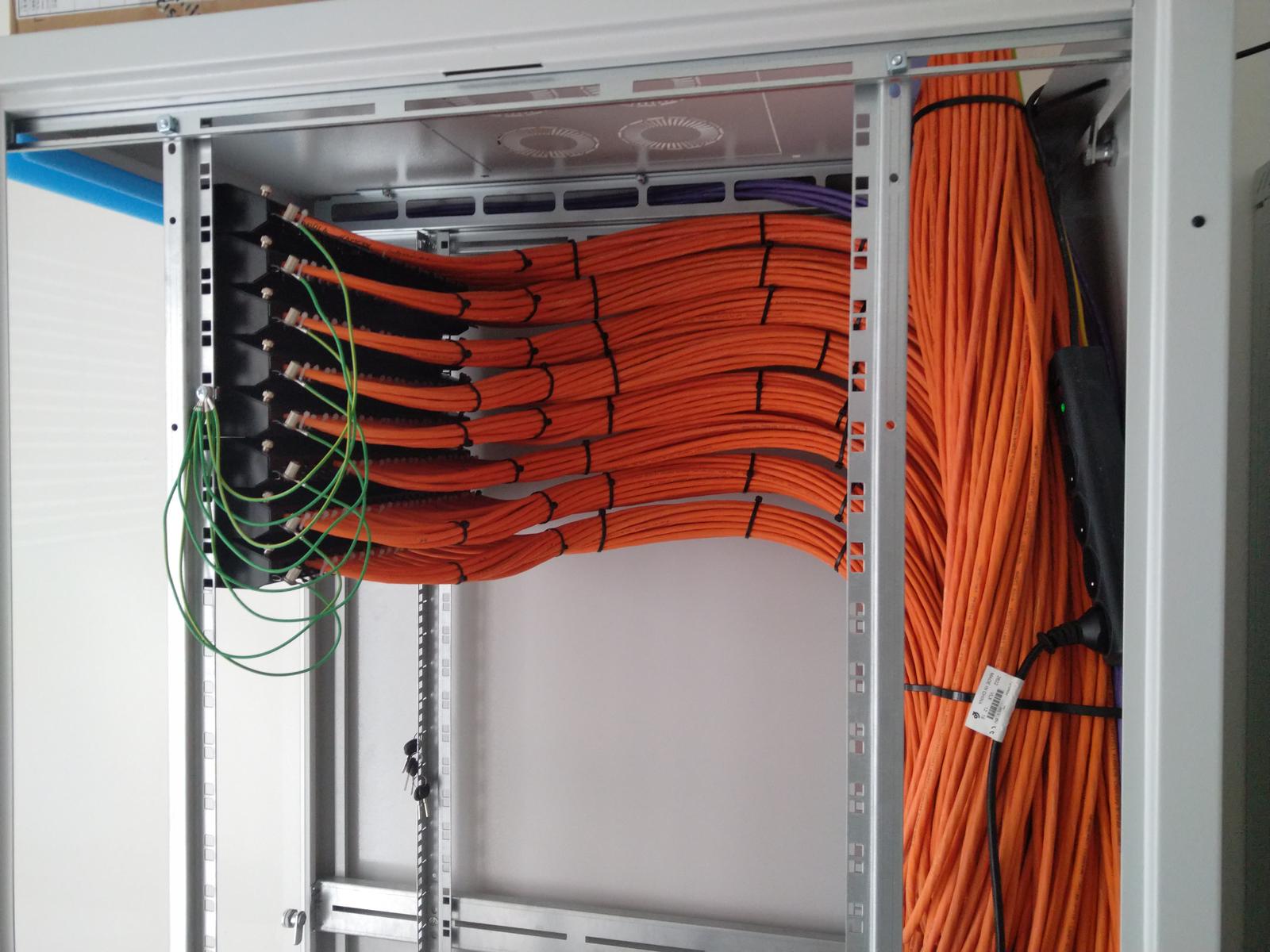 - Precízne osadenie dátových zásuviek a patch panelov v dátových rozvádzačoch